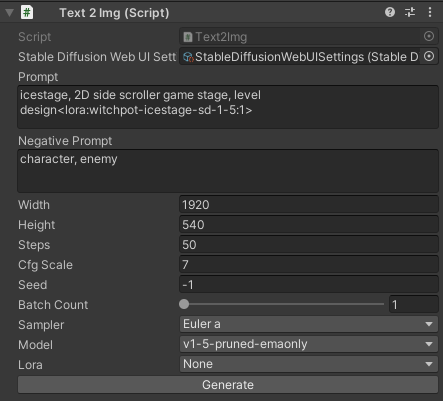 <table><thead><tr><th width="177">Parameter</th><th>Summary</th></tr></thead><tbody><tr><td><strong>Prompt</strong></td><td>Enter the words you want to generate in natural language</td></tr><tr><td><strong>NegativePrompt</strong></td><td>Input elements in natural language that you do not want to include in the generated image</td></tr><tr><td><strong>Width</strong></td><td>Width of the generated image in pixels</td></tr><tr><td><strong>Height</strong></td><td>Height of the generated image in pixels</td></tr><tr><td>Steps</td><td>Increase this parameter if the generated image looks blurry</td></tr><tr><td><strong>Cfg Scale</strong></td><td>Strength to follow prompts<br>Input larger value to strongly follow the prompt.</td></tr><tr><td>Seed</td><td><p>Fixing the seed value to generate a similar image</p><p>In case of -1, the image will be random</p></td></tr><tr><td>Batch Count</td><td><p>The number of images to be generated.</p><p>Select 1 to 100 images.</p><p>Generated images will be stored in StreamingAssets/StableDiffusion. Please check images by date sort in the explorer.</p></td></tr><tr><td>ExportType</td><td><p>Selectable output types: PNG, JPG, TGA</p><p>Apply to Image, RawImage, Material, etc</p></td></tr><tr><td>Sampler</td><td>Changing the nuances of the generated image</td></tr><tr><td><strong>Model</strong></td><td>Base trained model<br>See the "<a href="../production-tips/switch-models-lora">Switch Models/LoRA</a>" to switch new model</td></tr><tr><td><strong>Lora</strong></td><td><p>Additional trained Lora to generate consitent specific pattern image</p><p>See the "<a href="../production-tips/switch-models-lora">Switch Models/LoRA</a>" to switch new LoRA</p><p>If you select Lora, &#x3C;lora:filename:1>will be added to the Prompt and LoRA will be available</p></td></tr></tbody></table>